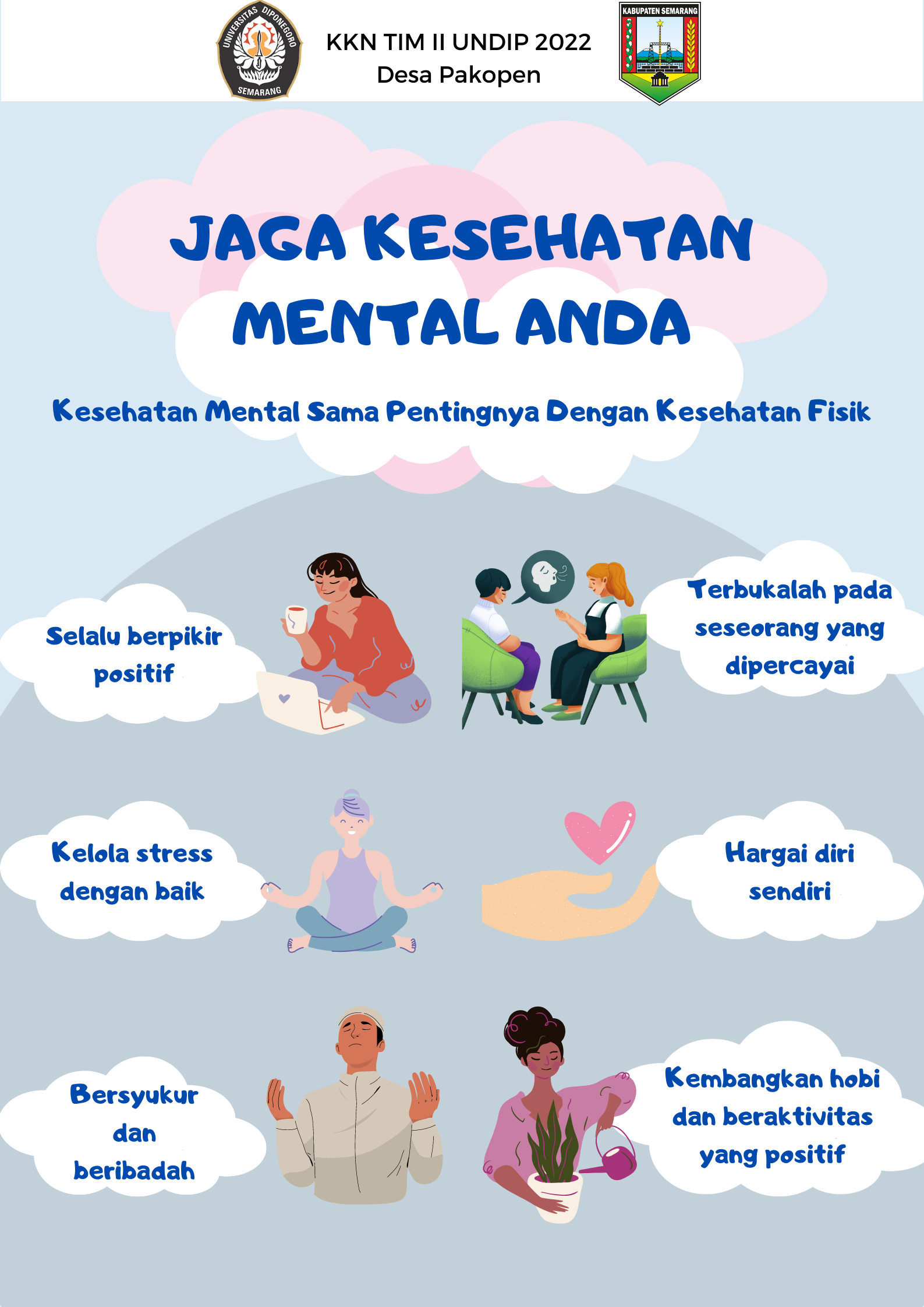 • Jaga Kesehatan Fisik: Olahraga teratur, tidur yang cukup, dan makan makanan yang sehat dapat berdampak positif pada kesehatan mental.